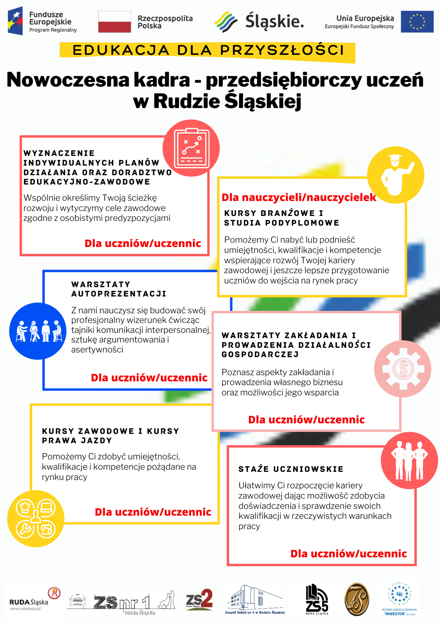 Celem projektu jest podniesienie kształcenia w Zespole Szkół nr 1, nr 2, nr 3, nr 5 i nr 6 w Rudzie Śl, na rzecz efektywnego wsparcia sprawiedliwej transformacji poprzez doskonalenie umiejętności